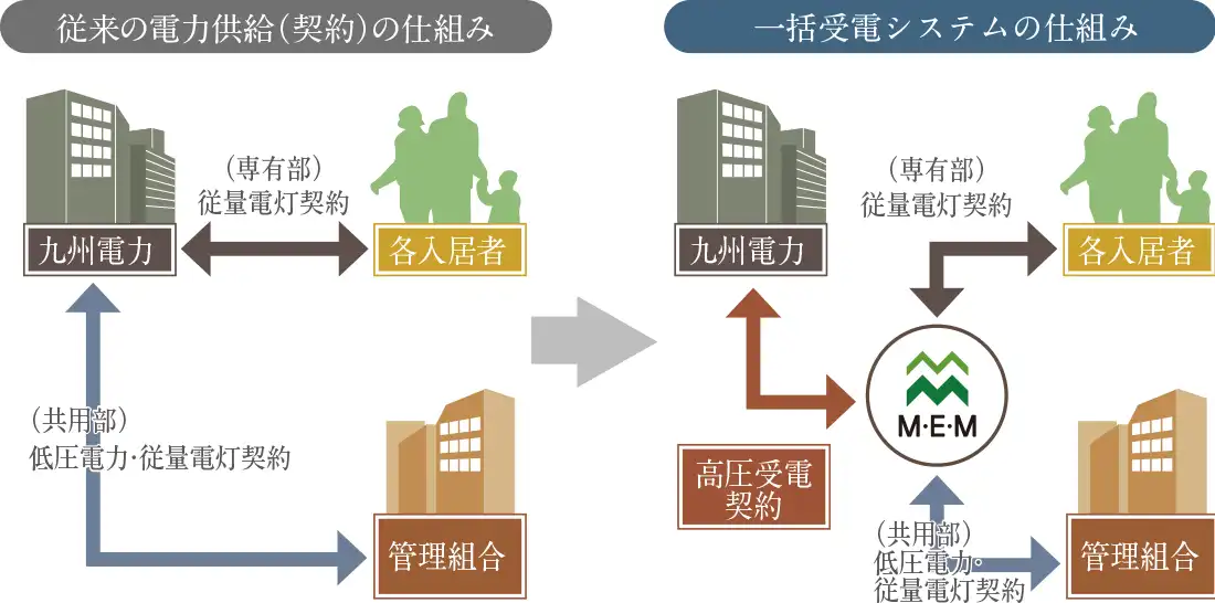 一括受電システムは、マンションの建物全体を一つの事業所とみなすことで、電力会社と高圧受電契約を結び、各ご家庭の電気料金を割安にする仕組みになっています。