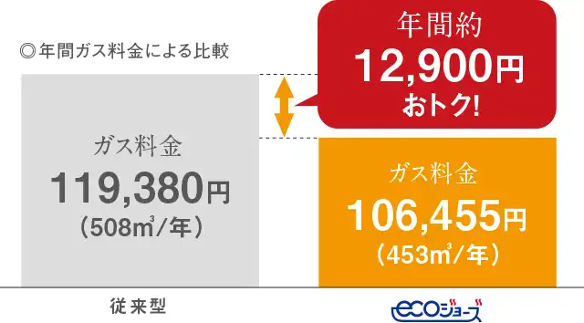 ガス使用量を削減。ガス料金も約11%減らすことで、従来型に比べ、年間約12,900円の節約になります。