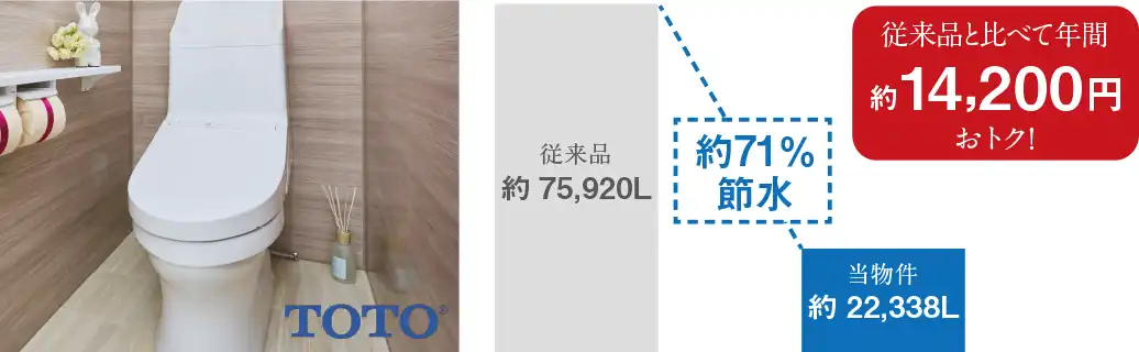 〈試算条件〉●洗浄水の使用量:従来品13ℓ/回、トルネード洗浄:大4.8ℓ、小3.6ℓ/回●条件:家族4人(男性2人、女性2人)大1回/日・小3回/日・人で水道代265円/㎥(「省エネ・防犯住宅推進アプローチブック」より)●従来品:年間約20,100円/当マンション:約5,900円※1:水道使用量は税込価格です。※情報提供元:TOTO株式会社