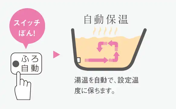 浴槽を断熱材で包み込んだ魔法びん浴槽を採用。浴槽断熱材と高断熱のふろふたのすぐれた断熱構造でお湯の温かさを保ちます。4時間後の温度低下はわずか2.5℃以内で光熱費も節約できるエコ仕様です。