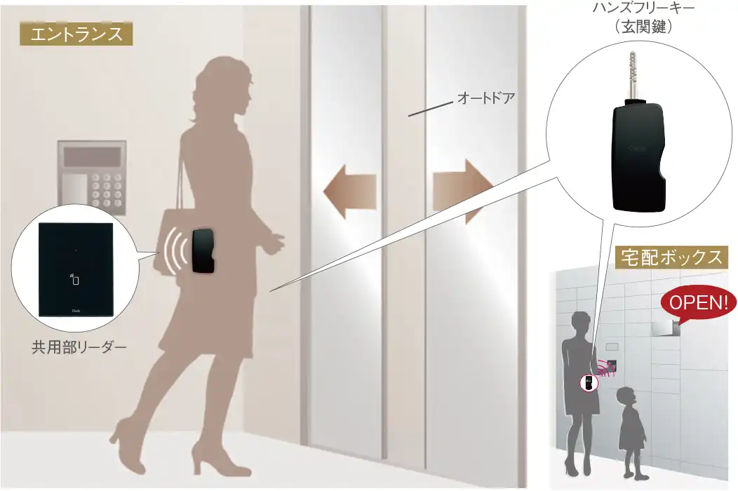 エントランスは、鍵を取り出すことなく、居住者を認識してオートドアをオープンします。宅配ボックスは、リーダに手をかざす事で、Tebraキーを認証し、お預かりしている荷物があれば、BOXが開きます。※ハンズフリーキーは各世帯2本、非接触キーは各世帯2本が標準となり、変更の場合は有償での対応となります。