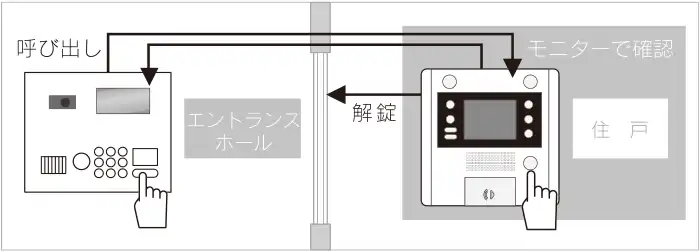- ② 住戸内のインターホンで来訪者を確認後、エントランス扉を解錠する。